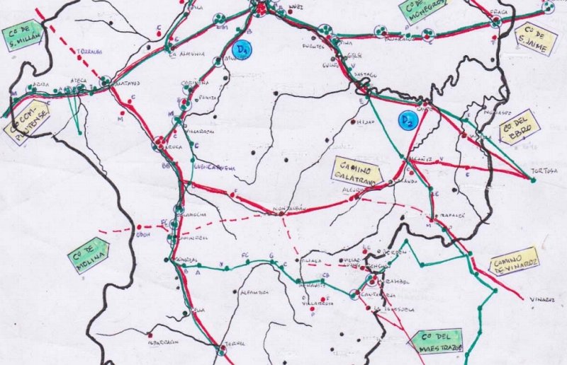Segons aquesta informació ho intento representar en un mapa: [Fes click damunt per ampliar] [GARGALLO, Eduardo (1993): La trashumancia actual. En "Cuadernos de la trashumancia", nº 14 (pp.44-65). Coord. Alex Farnós. ICONA. Madrid.] mapama.gob.es Nota: Els cinc itineraris de Jaume I es poden consultar en la web: Itin.1: 1231; Itin.2: 1231; Itin.3: 1233; Itin.4: 1249; Itin.5: 1259 [BARREDA, Pere-Enric. El camino de Jaime I por La Iglesuela y las Bailías. Cinco itinerarios de 1231 (2), 1233, 1249 y 1259. Pàg. 11. Edita: Centro de estudios de La Iglesuela del Cid (CEIG). La Iglesuela del Cid (Teruel). 2010.) Tractant de seguir la pista sobre aquest camí, llegim un llibre del professor Ubieto sobre peregrins per Aragó i parla d'un "Camino del Maestrazgo" que intueix però del que no acaba de tenir prou dades: De momento, no tenemos indicio alguno de que los habitantes de Castellón y Vinaroz y de los peregrinos que llegaran a sus costas utilizaran camino alguno a través del Maestrazgo. [Però sí que en tenim un testimoni i justament a Portell, d'una família de quatre persones (Johan Valero, la seva dona Francisca, la filla de sis anys Maria i l'àvia Maria la Grega) que, procedent de Nigroponte (en l'actual Grècia), pujaven des de Cinctorres i que anaven acompanyats d'un dels guies dels que parla Ubieto en aquest llibre. El que va amb aquesta família es diu Pedro de Ustamante. Els que troba Ubieto son de 1157 i es diuen Juan de Loara, P. de Ragadel i Berenguer de Ricla.] [Consultar aquest pas dels peregrins per Portell en el nostre arxiu, en l'any 1540.] Por el contrario, sí tenemos un par de datos concretos acerca del camino que desde Valencia (desde donde también podían ir por La Mancha a Santiago) atravesaba Aragón para ir a varios puntos de peregrinación, como Asís [al cor d'Itàlia], por ejemplo, como demuestra la documentación que se acompaña. Es el "Camino de Jaime I", porque fue este monarca el que ordenara abrir esta ruta real, que antes penetraba en Aragón siguiendo el difícil trazado del Turia. Sarrión, Teruel y Daroca son, de momento, los tres hitos existentes. (pàg.29) Romeros son, asimismo, los recordados en varios dances particulares, en los que un danzante (aparte del rabadán, demonio, ángel, moros, cristianos, etc.) encarna a un peregrino o peregrina [Documento 3]. En algunos casos, todo un dance completo, independiente de otros de la misma localidad, recibe el nombre de 'La Peregrina' cuales son los casos de Gallur y La Iglesuela del Cid, lugares bien distantes entre sí. Lo cierto es que nos aparecen estos personajes en poblaciones que hasta ahora no teníamos censadas como hitos de nuestros caminos romeros: Codos, Encinacorba, Odón y varios en el límite de Aragón lindando con Castellón y Vinaroz, en pleno Maestrazgo (Tronchón, Mirambel, Cantavieja y Fortanete -donde aparecen ocho danzantes mujeres peregrinas- aparte de la citada Iglesuela), lo que nos permite pensar en un itinerario nuevo, el "Camino del Maestrazgo", que veremos si es capaz de desarrollarse [Mapa 9]. En el dance de Fortanete, en el Maestrazgo, una coplilla del siglo XVIII describe en parte la vestimenta romera: "Baila la peregrina con su esclavina, con su pechina y su bordón; lleva zapatos blancos, medias de seda, medias de seda, son un primor". [...] En Valdealgorfa existió (construido en 1551 y hoy derruido) el 'Portal del Peregrino', una de las puertas de ingreso a la villa; [...] y 'Masía o Mas del Peregrino' en Alcorisa o La Cuba. [...] En Pitarque y en Güel, encontramos el 'Término de Peregrinos', mientras que en Mirambel podemos hallar la 'Solana del Peregrino'. (pàg.36-38) Incluiremos el largo viaje de un santo (san Vicente) hacia un martirio en Valencia, la reconstrucción de un itinerario concreto (Daroca-Teruel) realizado tras el estudio de la documentación de la zona. [...] Se han recogido todos los recorridos o viajes en un solo mapa. [...] Es interesante estudiar el recorrido que se vio obligado a realizar san Vicente desde Huesca hasta Valencia en el siglo IV, época tan alejada de la peregrinación jacobea, aunque no de otras, como Roma y Jerusalén que estaban vivas y viajaron muchos hispanos. Lo llevaban a la ciudad mediterránea para ser martirizado. El recorrido no se despega ni un ápice de las calzadas romanas que aún debían estaren buen uso. Por ejemplo, la comitiva pasa por Cariñena y Daroca (recorrido que durante mucho tiempo posterior tuvo poco uso) y desde Monreal toman una calzada romana secundaria hacia Cantavieja y Mirambel, actualmente recordada por los muchos topónimos "calzada" diseminados por los términos de la zona. Ante la carencia de datos posteriores, parte del último tramo habrá que tenerlo presente al hablar del "Camino del Maestrazgo".