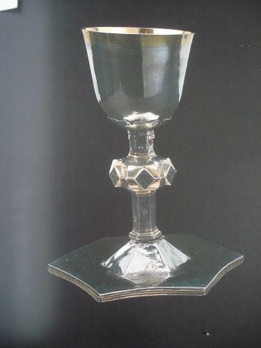 El cáliz o copa eucarística es una tipología procedente de los objetos civiles, con la particularidad que, aunque sea de plata, su interior ha de ser dorado. Según el Decretum Gratiani: "Ut calix domini cum patena, si non ex auro, omnino ex argento fiat. Si quis autem tam apuper est saltem vel stanneum calicem habeat. De aure, aut orichalcho non fiat calix quia ob vini virtutem eruginem parit quae vomitum provocat. Nullus autem in ligno aut vitreo calice presumat missam canire (Decretum Gratiani, III, Distinctio I, XLV. Citado por Gudiol II, 1933, pp. 451). Estructuralmente se compone de pie, el eje y la copa. Se trata de un cáliz de pie en forma de estrella de seis puntas, con caras de perfil cóncavas y lisas, excepto una representación de una cruz en el monte calvario. El astil es hexagonal de seis caras sin decoración, está dividido en dos tramos de los que el inferior es más largo. El nudo o manzana es esférico achatado, seisavado, con un rombo saliente en cada una de sus caras, que muestran una flor de cuatro pétalos y el anagrama IHS. La sotocopa con seis pétalos lisos y adorno burilado en la parte inferior acoge la copa cónica que es totalmente lisa. La pieza debería situarse entre los años 1380 y 1400 si bien la copa parece de finales del siglo XV. El pie sigue la pauta de los modelos de finales del siglo XIV y XV procedentes del obrador barcelonés, aunque el ensamblaje es característico del taller morellano y el nudo responde a modelos de origen levantino. Milián señaló que la pieza estaba punzonada por talleres valencianos. Como paralelo se puede citar el cáliz de la Jana (Gargallo, 1967, p. 97). El cáliz del Museo Episcopal de Vic (núm. de inv. MEV 1612) es un referente por la similitud de ambos pies (Gudiol II, 1933, p. 452). LSLL BIBLIOGRAFIA: MILIÁN, 1952, p. 310; MILIÁN, (IMD., s/p), p. 577 ZARAGOZÁ CATALÁN, Arturo. Morella, floreciente villa real (siglos XIII-XVII). La memòria daurada. Obradors de Morella s.XIII-XVI. Pàg. 288. Fundació Blasco de Alagón. València. 2003 lamemoriadaurada.com (enllaç caigut) |
