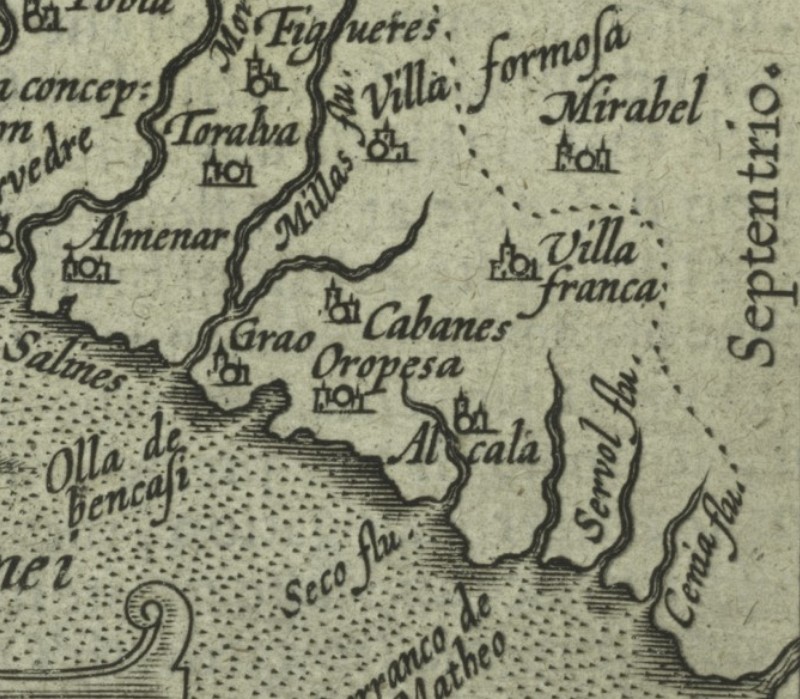 En aquest fragment, trobem Vilafranca (Villa franca), Mirambell (Mirabel), Villahermosa (Villa formosa), Cabanes, Alcalà de Xivert, Orpesa Benicàssim (Olla de bencasi), el Grao (de Castelló), Almenara (Almenar), Torralba del Pinar (Toralva) i Higueras (Figueres); i ens indica també els rius: riu Sénia (Cenia flu.), riu Cervol (Servol flu.), rambla de Cervera (Barranco de S. Matheo) -que no dona al mar com posa ací sinò que és afluent del riu Sec, que també el dibuixa-, riu Sec (Seco flu.), riu Millars (Millas flu.), riu Palància (Morvedre flu.) i encara que no apareix en aquest fragment de mapa, continua amb el riu Túria (Guadalaviar rio -que no flumen-). [ORTELIUS, Abraham (1603): The Kindome of Valentia. Valentiae Regnum. Lionel Pincus and Princess Firyal Map Division. Ed. Coignet, Michel.] digitalcollections.nypl.org |