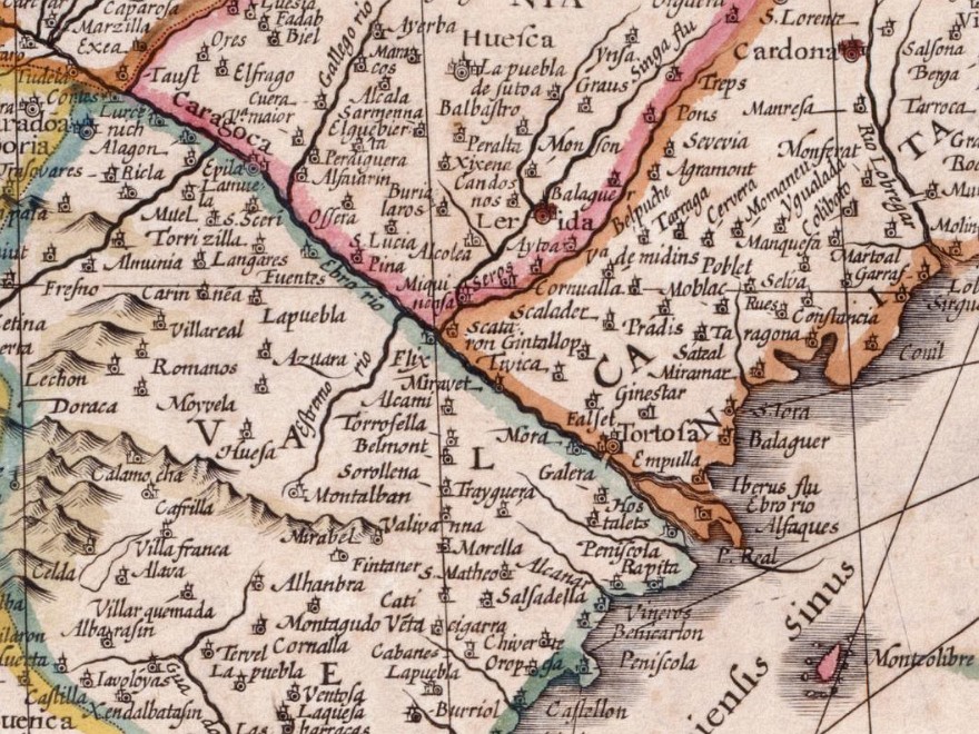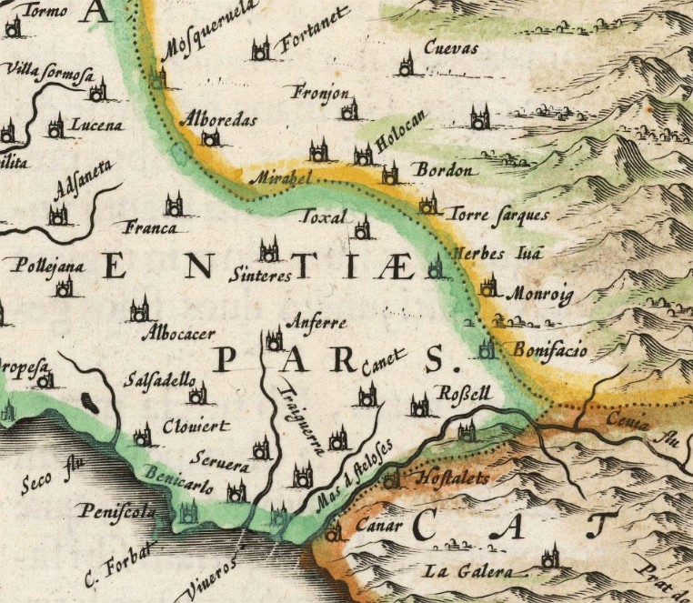 Fragment d'un mapa de Willem Janszoon Blaeu. "First edition of Blaeu's decorative map of Aragon & Navarra". Dels pobles de la comarca dels Ports, trobem: Cinctorres (Sinteres), Forcall (Toxal), Vilafranca (Franca), i els que situa en Aragó: Herbers (Herbes Iuá) i Olocau (Holcan), a més de les Alberedes (Alboredas). Altres pobles són: Mont-roig (Monroig), Torredasques (Torre Sarques), Bordón, Mirambel (Mirabel), Tronchón (Fronjon), Fortanete (Fortanet) i Mosqueruela. A més, hi ha llocs com: Val de monleon, Val de Ossera i Mas delcol (Mas del Coll, en Rossell, vora el riu Cervol). Castilla de cobre és Castell de Cabres.