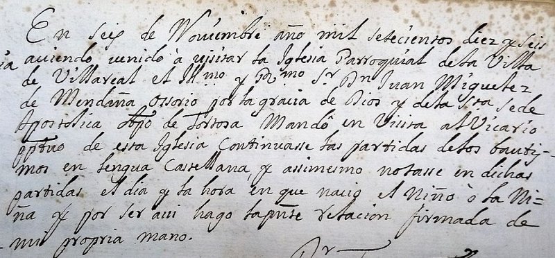 Agost. En Forcall, els llibres de registre de l’esglèsia estan escrits en valencià fins agost de 1716, data en que apareix el castellà i ja fins l’actualitat. Cal tenir en compte que l'11 de setembre de 1714 entra en vigor el Decret de Nova Planta, quan Felip V esdevé monarca absolut en tota Espanya, un cop acabada la guerra de Successió. Es prohibeix l'ús oficial del català, queno se recuperarà fins a la Segona República, en 1931 (serà cooficial amb el castellà). Però en acabar la Guerra Civil, en 1939, es torna a prohibir. Caldria esperar a la mort del dictador Franco i a la recuperació dels poders catalans l'any 1979. [EIXARCH FRASNO, José. Forcall y Pueblos de la Comarca dels Ports. Trabajos Históricos (1966-1993). Ayuntamiento de Forcall. 1994] A Vila-real, el bisbe ho deixa ben clar. Si aquesta visita va ser el 6 de novembre de 1716, a Vilafranca sabem que va estar també el 13 d'agost del mateix any: