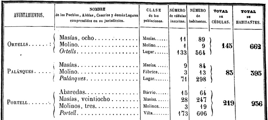 Ortells: 145 cédulas - 662 habitantes - Masías, ocho - Masías - 11 c. i. - 89 h. - Molino - Molino - 1 c. i. - 9 h. - Ortells - Lugar - 133 c. i. - 564 h.
