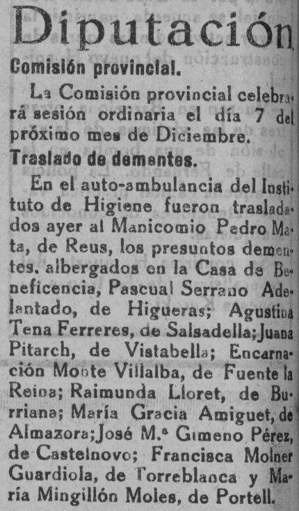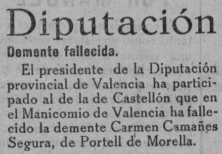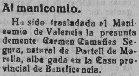 trasladada al Manicomio de Valencia la presunta demente Carmen