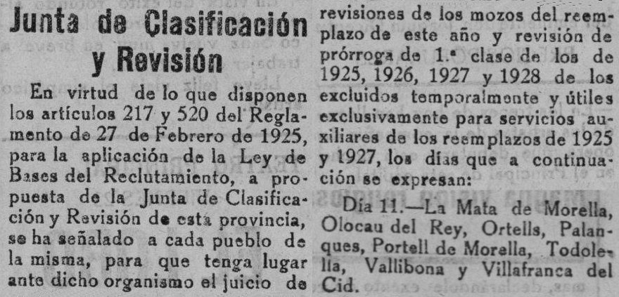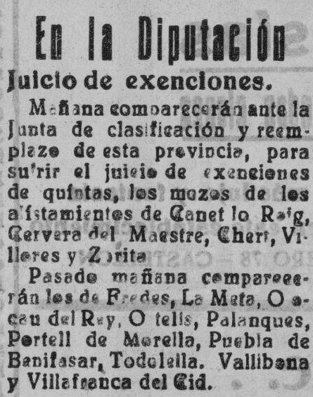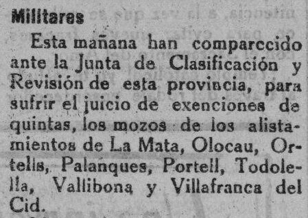 quintas, los mozos de los alistamientos de Canet lo Roig, Cervera