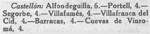 Segorbe, 4; Villafamés, 4; Villafranca del Cid, 4; Barraca, 4;
