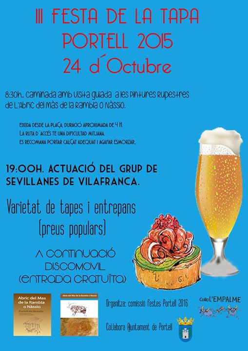 Pel que fa a les eleccions al Senat, ho posem entre parèntesi per simplificar, ja que es votava als candidats més que al partit. (20-10-2015) Avui està ennuvolat i plou amb poca intensitat. Poc i massa tard per al rovelló. No ha sigut bon any, no! En fi, què li farem! Sort que la festa no para i, aquest cap de setmana, a Portell, la Comissió de Festes de l'any que ve, ens conviden a la III FESTA DE LA TAPA. De matí, caminada a les pintures rupestres. De vesprada, "sevillanes" i tapes. I ja, de nit, discomòbil. Ahí teniu el cartell: