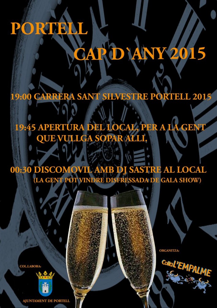 Historial de pàgines de novetats: any 2015 2003 2004 2005 2006 2007 2008 2009 2010 2011 2012 2013 2014 2015 2016-23 La Comissió de festes de l'any que ve ens conviden a celebrar la Nit de Cap d'Any amb la segona "Sant Silvestre" portellana i, per la nit, sopar de totes les colles que vulguen al local, on tindrem festa assegurada amb DJ Sastre. No faltarem!!!