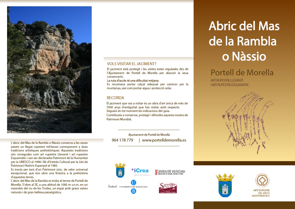(26-05-2015) Fa un temps, Ismael Gil i jo (Jacint Cerdà) vam trobar unes pintures rupestres al terme de Portell. Davant la importància i repercusió que sabíem que això tindria, vam esperar l'ocasió propícia per tal de posar-ho en mans d'experts que ho pugueren estudiar i valorar. Finalment, el moment va arribar i, ara, per fi, es fan públics els resultats. Són pintures de fa uns 7.000 anys i es veuen un parell de formacions d'homens amb arcs, diversos animals, com cabres salvatges i cèrvols, i una cosa curiosa, la impressió dels dits de la mà esquerra de l'artista. Si les voleu visitar, us hem d'advertir que estan molt desgastades i que a penes es veuen. Demà dissabte es farà la presentació, a les 10:00 h. Ací us passem el tríptic que ens han fet arribar. Si cliqueu damunt, el podreu vore una mica més gran.